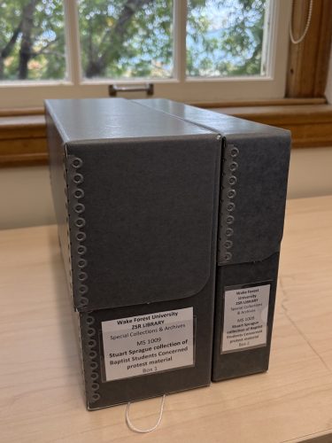 Four days after I started in my new position, I was scheduled to meet a donor of a small, but impactful collection of documents relating to the efforts of a Baptist student group, primarily from 1968 to 1970. The donor, Stuart Sprague, Ph.D. (1947- ), was a student protester in Baptist Students Concerned, a progressive student group, and played a crucial role in their efforts at the 1968, 1969, and 1970 Southern Baptist Convention (SBC) annual meetings. Importantly, Sprague collected and retained the material evidence of these activities and consulted this material for his own research, and upon the conclusion of his research, decided that Wake Forest University, with its rich collection-base of Baptist collections, would be an ideal home for the files for the long-term.