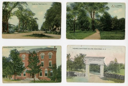This collection has about 100 postcards, mostly dated 1910-1916. The correspondence starts while Ivan Bennett was a student at Wake Forest College and Ruby Jenrette was a middle school student. The postcards feature humorous cartoons and images of local landmarks, including these images of Wake Forest’s original campus.