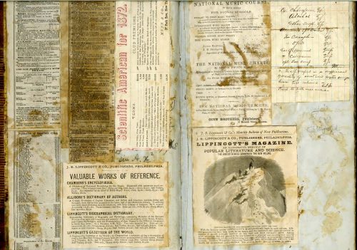 This is a fascinating bookâon the outside it looks like a simple ledger book, and given that W.G. Simmons was the college bursar, that is what I expected it to be. But as I started reading it, there is so much more to be found in this volume. The majority of the pages have lecture notes in the fields of chemistry and natural history. The first few pages were also used as a scrapbook, with newspaper clippings (mainly related to chemistry or other scientific topics) pasted in. There are some financial records to be found here, which could provide some information about college finances during the Civil War period.