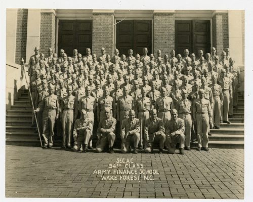 This one was a crash course in Wake Forest history! In 1942, several buildings on campus were rented by the Army Finance School, which trained accountants for the army. This collection, dated 1943, includes photographs, course schedules, and graduation lists from the Army Finance School.