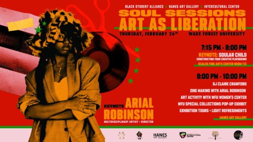 On Thursday, February 26, Hanes Art Gallery will host Soul Sessions: Art as Liberation in partnership with the Black Student Alliance and the Intercultural Center. The keynote, “Soular Child: Constructing Your Creative Playground” with multidisciplinary artist Arial Robinson will take place from 7:15-8:00 PM in Scales Fine Arts Center, Room 112, followed by activities in Hanes Art Gallery from 8:00-10:00 PM.