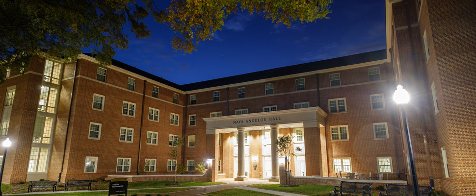Angelou Residence Hall is a first-year dorm built in 2017 and named after Dr. Maya Angelou, who was the Reynolds Professor of American Studies at Wake Forest from 1982 until her passing in 2014. Angelou is a co-ed corridor-style building and houses amenities such as a formal parlor, classroom, media room, recreation lounge, community kitchens, hall lounges and study spaces, and a sun deck.